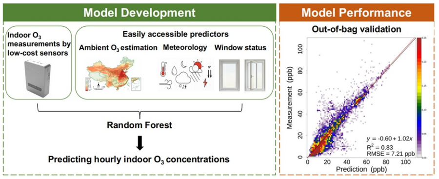 The team collected over 8,200 hours of indoor O₃ data using portable electrochemical sensors in 23 households. Predictor variables included outdoor O₃ levels (from high-resolution random-forest and MERRA-2 datasets), meteorological parameters (temperature, humidity, wind, solar radiation, boundary-layer height, and surface pressure), and window-opening status recorded manually by volunteers. Two random forest models were compared: one excluding and one including window status. Incorporating window behavior raised cross-validation R² from 0.80 to 0.83 and lowered RMSE from 7.89 to 7.21 ppb. The model accurately captured hourly O₃ fluctuations and regional differences, performing better in southern than northern China and in the cold than warm season. Predictor-importance analysis showed surface pressure, temperature, and ambient O₃ as dominant factors, with ventilation emerging as a crucial behavioral determinant. Diurnal comparisons revealed that indoor O₃ concentrations were 40% lower than outdoor levels during the day, underscoring the buffering effect of indoor environments.