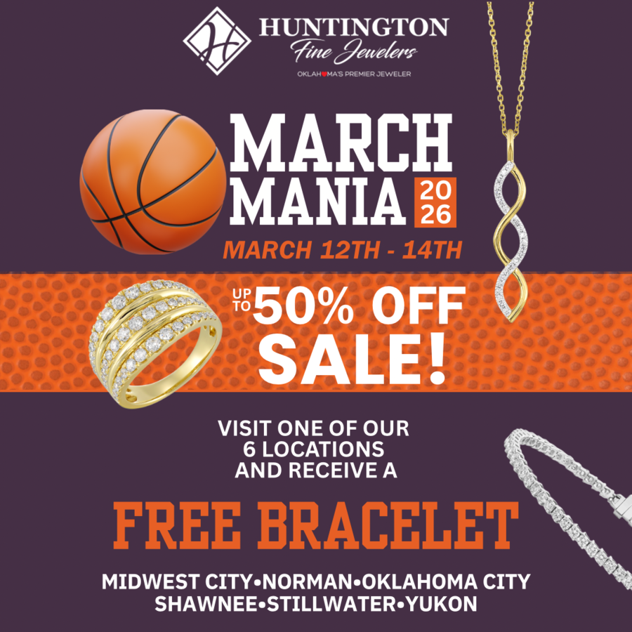 Don’t miss out on Huntington’s annual March Mania sale, running March 12th through 14th. Visit any Huntington Fine Jewelers Oklahoma jewelry stores, or shop online to save up to 50% and enter for a chance to win a shopping spree.